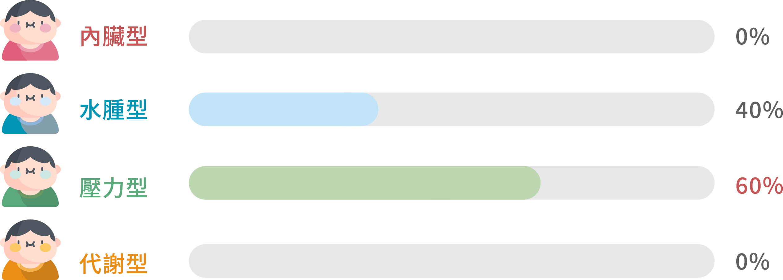 • 體脂集中於腹部、背部與下半身(虎背熊腰)