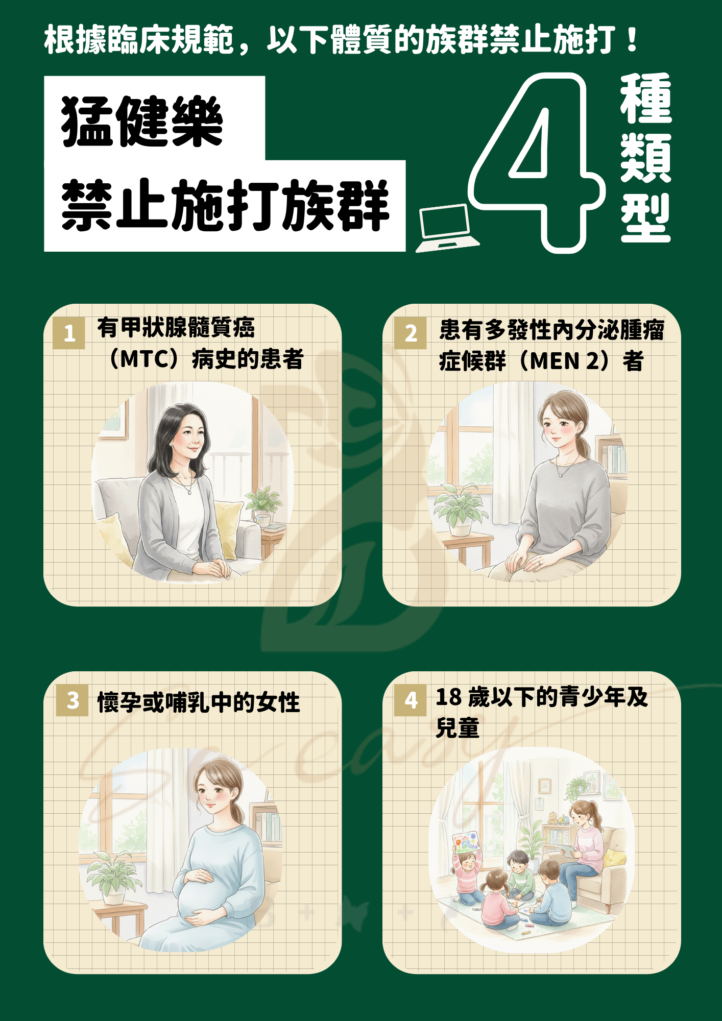猛健樂較適合「病態性肥胖」且合併「代謝問題」的族群。然而,根據臨床規範,以下 4 類人禁止施打: