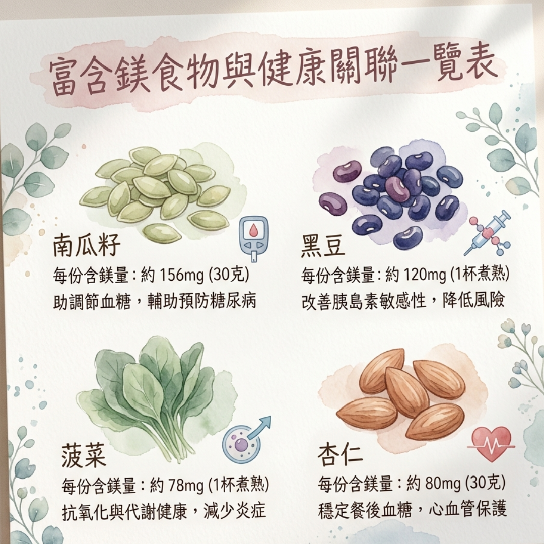 補鎂最好的天然食物:南瓜籽、黑豆、菠菜、杏仁、藜麥。每天一把南瓜籽(約 28 克),可補充約 150 mg 的鎂,是最輕鬆的日常補充方式。